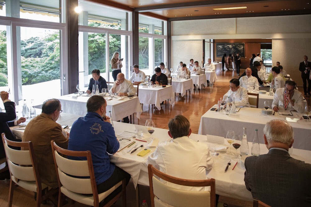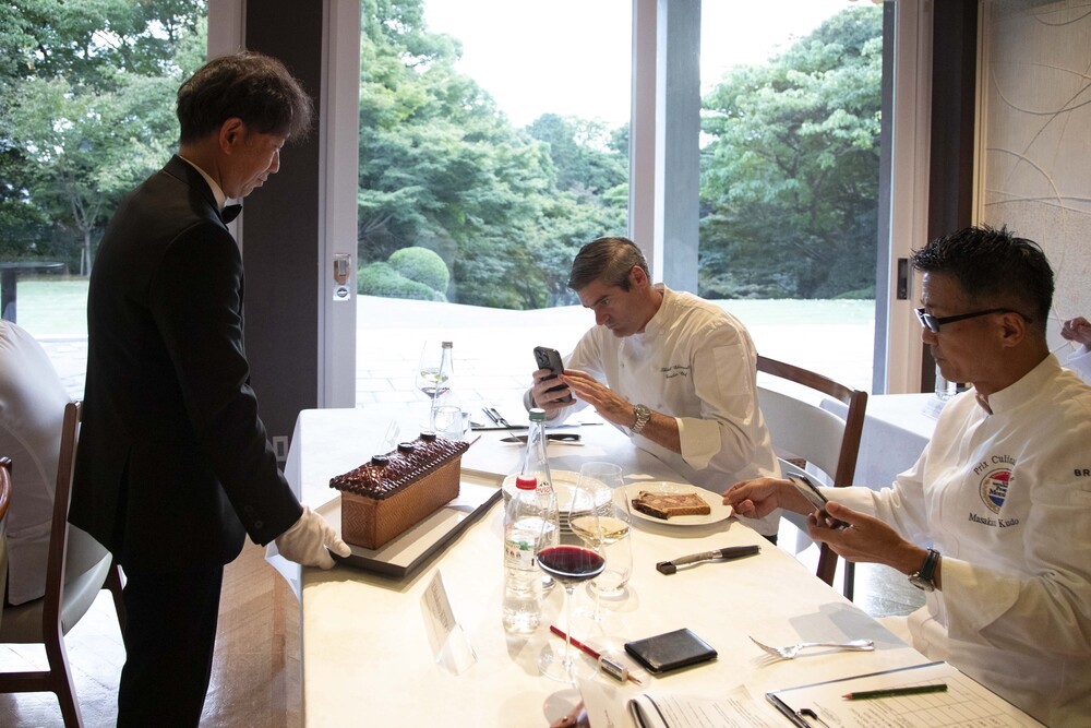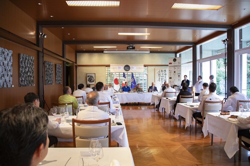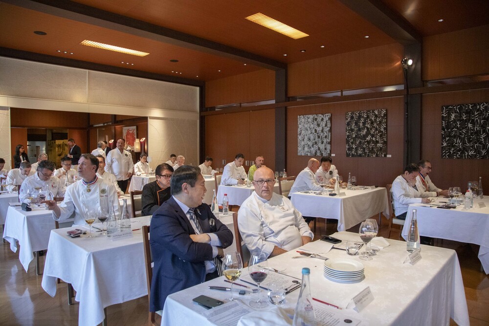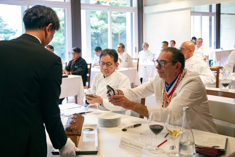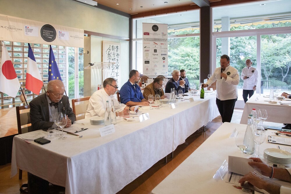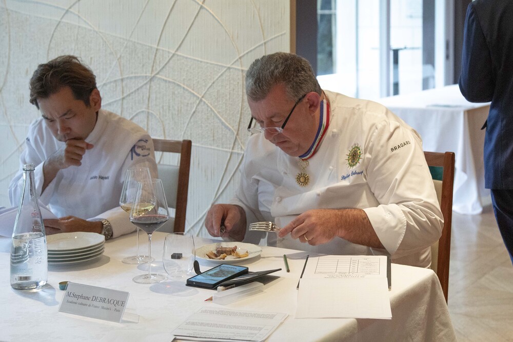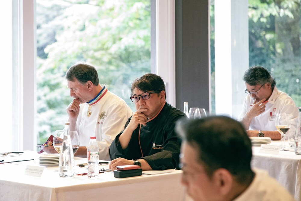 さらに、リヨンで開催される世界選手権ファイナルおよび世界各地の地区決勝戦に多大な貢献をされている、タン・エルミタージュの名門ワイナリー「M.・シャプティエ」当主、ミシェル・シャプティエ氏が名誉審査員としてご来臨くださいました。審査はフランス人および日本人著名シェフ各10名に加え、プレス審査員、特別ゲストを含む総勢25名の審査員チームにより、厳正な試食審査が執り行われました。