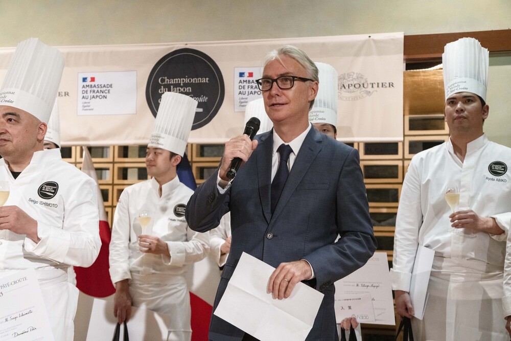 授賞式の開幕に際し、フィリップ・セトン大使は、パテ・クルートという中世シャンパーニュ=アルデンヌ地方に端を発する伝統料理が、遠く離れた日本の地においてこれほどまでに温かく迎えられ、祝福されている光景に触れるたび、深い感動と驚嘆の念を禁じ得ないと述べられました。さらに、フランス料理の中でもとりわけ高度な技術と芸術性を要するパテ・クルートのコンクールが、新たな才能の発掘と育成の場として大きく寄与していること、そしてこの催しが日本におけるフランス・ガストロノミーの発展において極めて重要な位置を占めていることを高く評価されました。併せて、ファイナリストたちの健闘を称えるとともに、審査員ならびに協賛企業の皆様の多大なるご尽力に対し、深甚なる敬意を表されました。